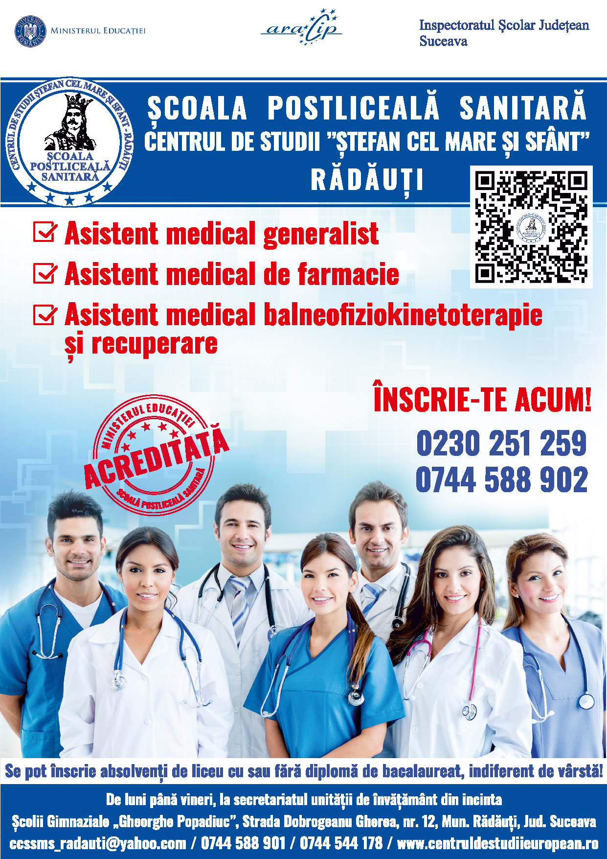 Înscrierile se fac la secretariatul unității de învățământ Școala Postliceală Sanitară Centrul de Studii „Ștefan cel Mare și Sfânt – Bucovina” Rădăuți, Str. Dobrogeanu Gherea nr. 12, Radauti, în incinta Școlii Gimnaziale “Gheorghe Popadiuc”.